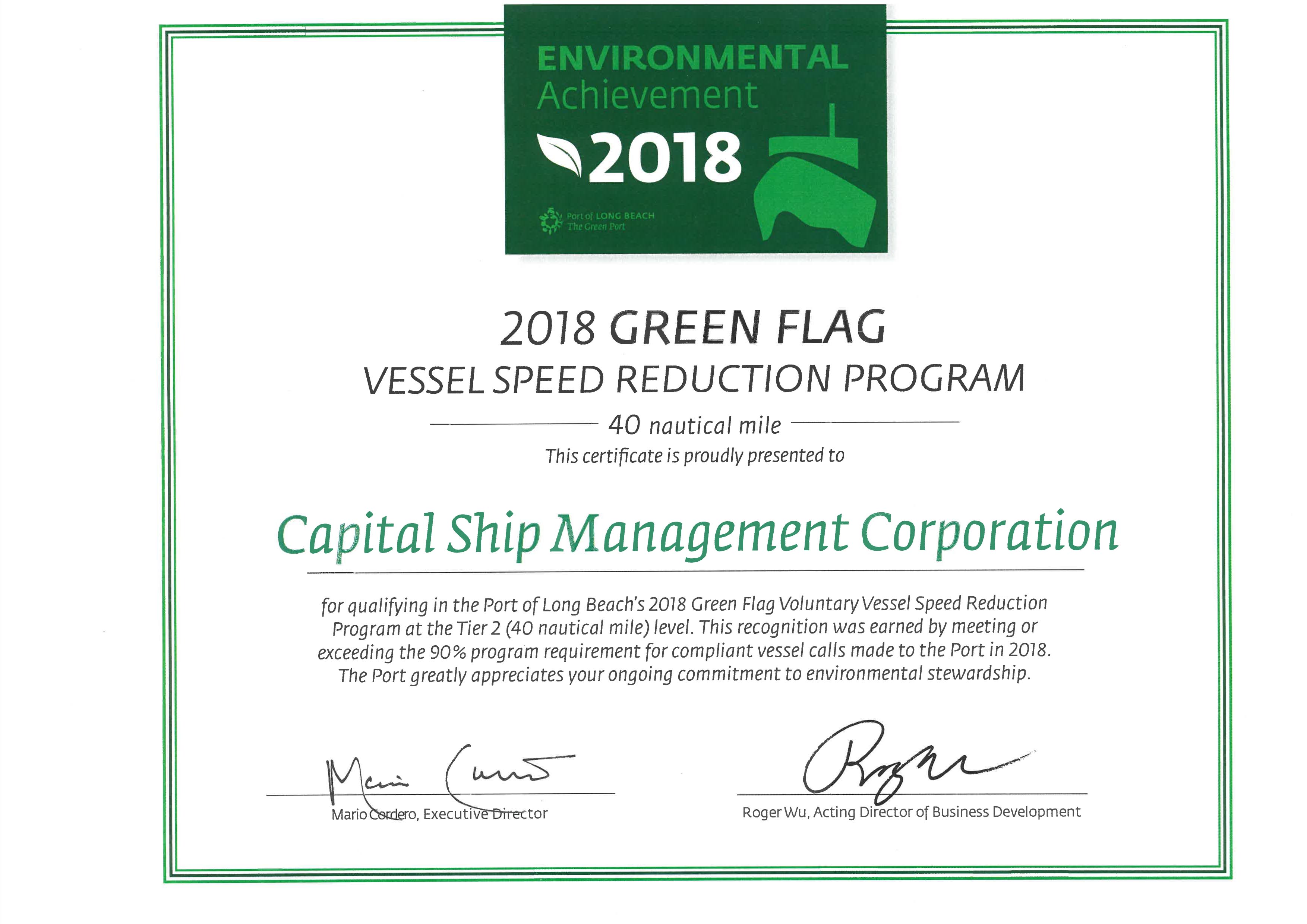 This award is being granted to operators that called the Port of Long Beach in 2018 and demonstrated that 90% or more of all their vessel trips complied with the Green Flag – Voluntary Vessel Speed Reduction Program.