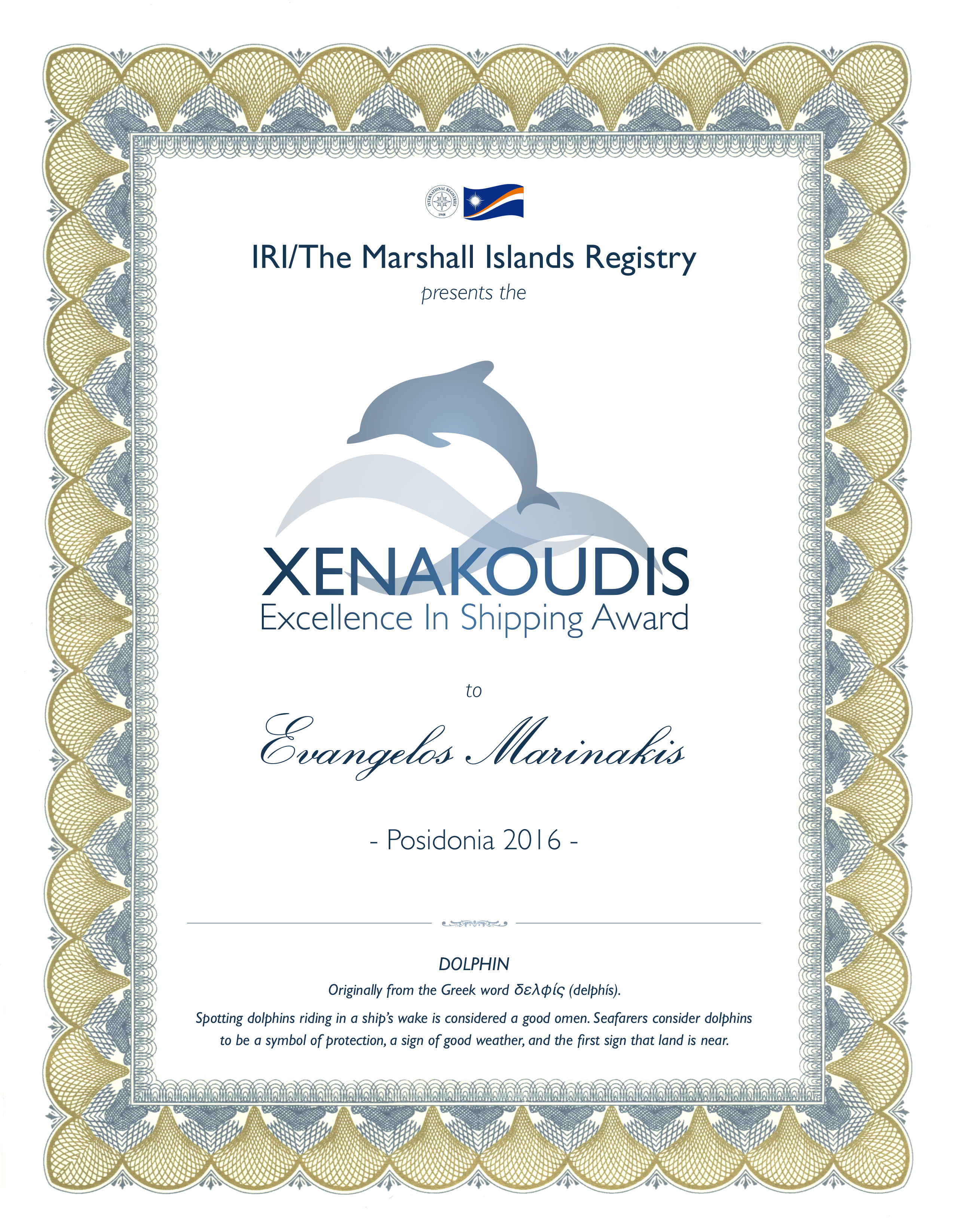 Mr. Theofilos Xenakoudis, Director, Worldwide Business Operations of RMI, commented: “It is the first time that we present “the “Xenakoudis Excellence in Shipping Award”. It is offered to a special individual, who fulfills many criteria. The Marshall Islands Registry recognizes the importance of safety, security, technology and environmental awareness and strives to commend tremendous contributions to the industry by its ship owners and operators. We are honored to award someone tonight for his ongoing commitment to upholding these outstanding values in the shipping industry and we will present him with the first “Xenakoudis Excellence in Shipping Award”.